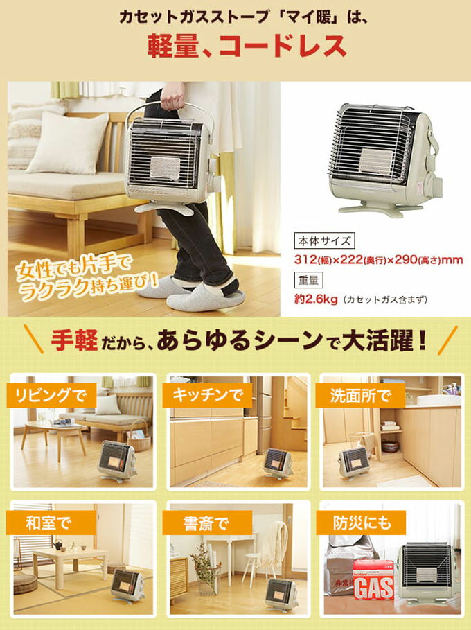 電池も電源コードも使わない!家中何処でも暖かさを持ち運ぶ!イワタニ カセットガスストーブ ポータブルタイプ マイ暖 CB-STV-MYD2◆電池も電源コードも使わない!家中どこでも、暖かさを持ち運ぶ。