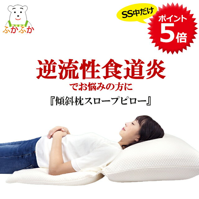 傾斜枕・スロープピローの解説 睡眠中に突然、胃酸が込み上げることはありませんか? スロープピローなら、適度な傾斜がある分厚い枕なので 無理なく上体を起こせて楽な寝姿勢がとれますから 逆流性食道炎の方や夜中に喘息の発作が起きたときの ように横になると苦しかったり辛いときの対策にもおすすめ です。