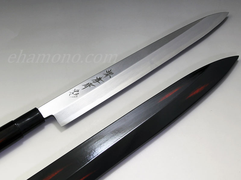 柄と鞘に、漆器などに用いられる塗りを施した美しい包丁です。