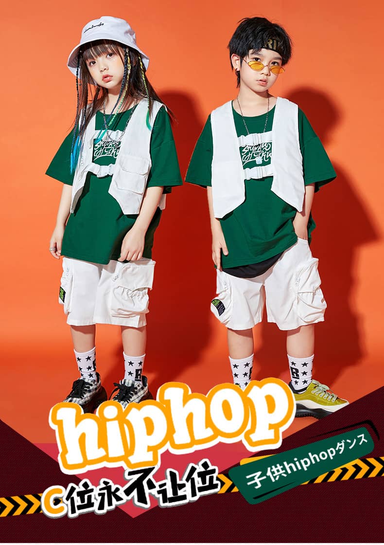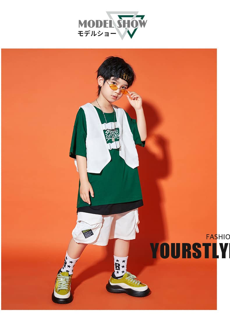 子供ダンス 男の子 女の子 学生 ダンス衣装 2点セット 3点セット 半袖 Tシャツ ベスト 短パン 子供ダンス Hiphop チアダンス 白 緑 団体注文 110-180cm