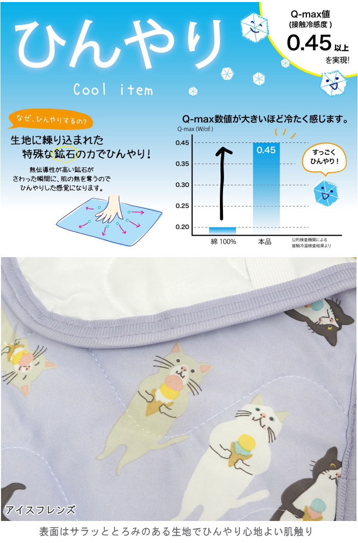 生地に練りこまれた六趣な鉱石の力でひんやり! 熱伝導性が高い鉱石がさわった瞬間に、肌の熱を奪うので ひんやりした感覚になります。