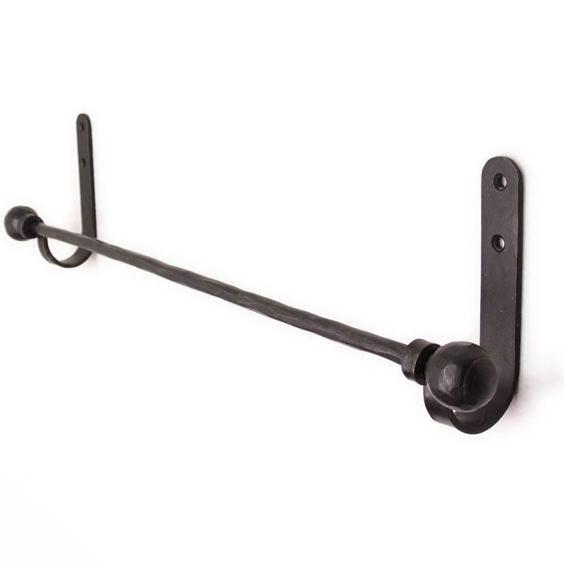 ロートアイアンのタオルハンガー、すっきりとしたプレーンなデザインのホルダーとボールオーナメントのバーを組み合わせた、アイアンのタオル掛け。