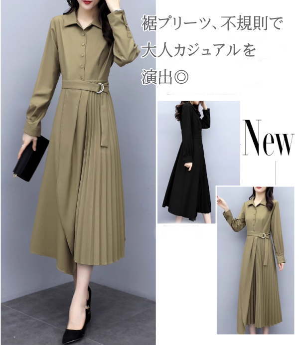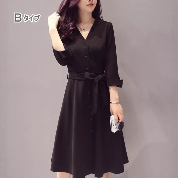 一部即納 ワンピース Aライン 膝丈 Vネック 長袖 フレアスカート ウエストリボン ハイウエスト ワンピ ブラック きれいめ 黒 レディースおうちコーデ (アパレル)