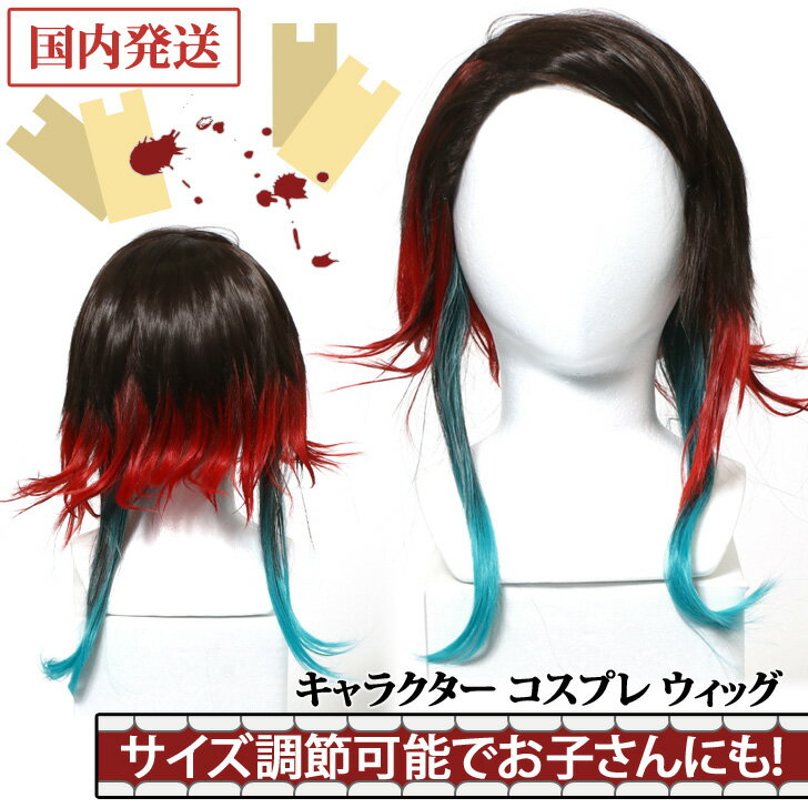 送料無料 キャラクター コスプレ ウィッグ レッド×ブルー×ブラウン 夢 鬼 かつら カツラ ミディアム セミロング 下 壱 仮装 変装 コスチューム カットウィッグ 練習用ウィッグ 美容師 アニメ マンガ なりきり アジャスター キッズ 大人 メール便
