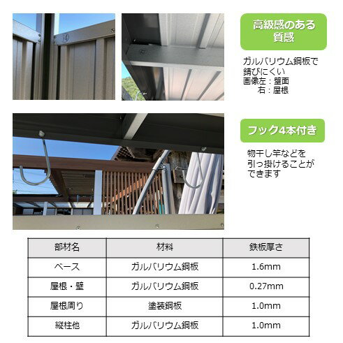 ●屋 根:化粧板 ●塗 装:メラミン塗装 ●パネル面:ガルバリウム鋼板 ●付属品:アンカープレート4本・竿掛けフック4本 ※ガルバリウムとは・・「亜鉛」と「アルミ」「シリコン」を組み合わせた合金のことです。
