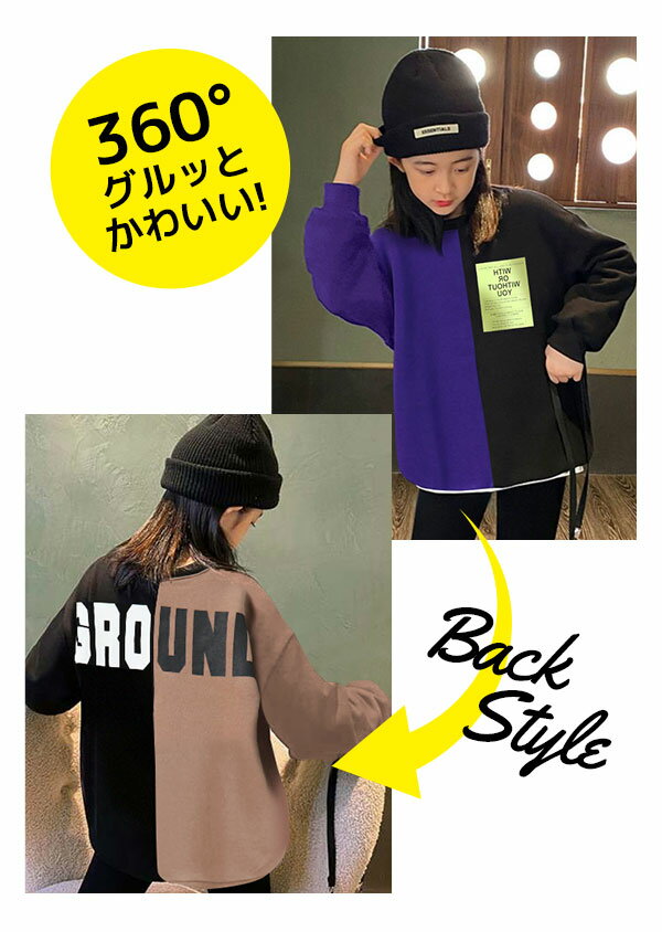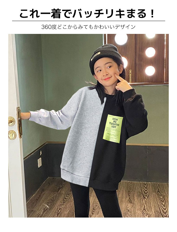 あったか 裏起毛 オーバーサイズ でかロゴ 切替え 長袖 トレーナー トップス ユニセックス キッズ ジュニア 子供 服 幼稚園 小学生 男の子 女の子 ガールズ 子供服 おしゃれ かっこいい 可愛い 流行 防寒 シンプル ベーシック 着回し 春 秋 冬 お揃い 韓国子供服 暖かい