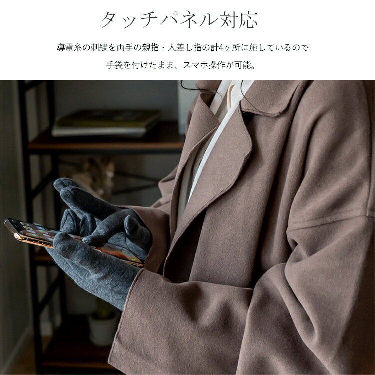また、両手親指・人差し指に導電糸で刺繍しているので 手袋をつけたままスマートフォンやタブレットの操作が可能。