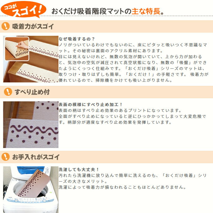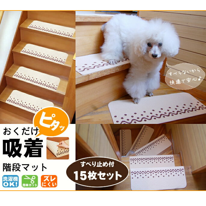 犬用 カーペット リビング 階段 マット■ 会社概要 ■ お支払いと送料について おくだけ吸着階段マット すべり止め付 15枚入り 洗濯機で洗えて!取りつけ・取りはずしも簡単! なぜ吸着するの? ノリがついているわけでもないのに、床にピタッと吸いつく不思議なマット。